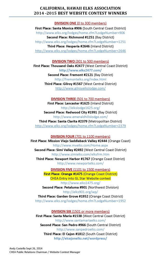 2014-2015 CHEA Best Website Contest Winners Announced California-Hawaii Elks Association Posted on December 11, 2014 by CharisceAugust 15, 2023