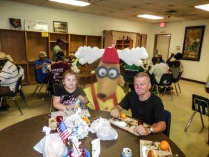 The Clovis Elks Lodge No. 2599 used an Elks National Foundation Gratitude Grant to sponsor 2,700 meals for the hungry and homeless in the greater Fresno/Clovis area. Elroy The Elk was on hand for photos and to help distribute Elks Drug Awareness Program coloring books and crayons to the families with children. The event took place over the Memorial Day weekend at the Poverello House in Fresno.