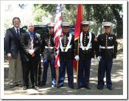 Pictured are (L – R): The Honorable Louis (Jim) Grillo, PGER, Mike Dugan, Exalted Ruler, and the U.S. Marine Corp Color Guards of Lathrop.