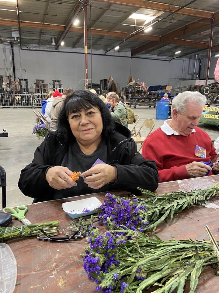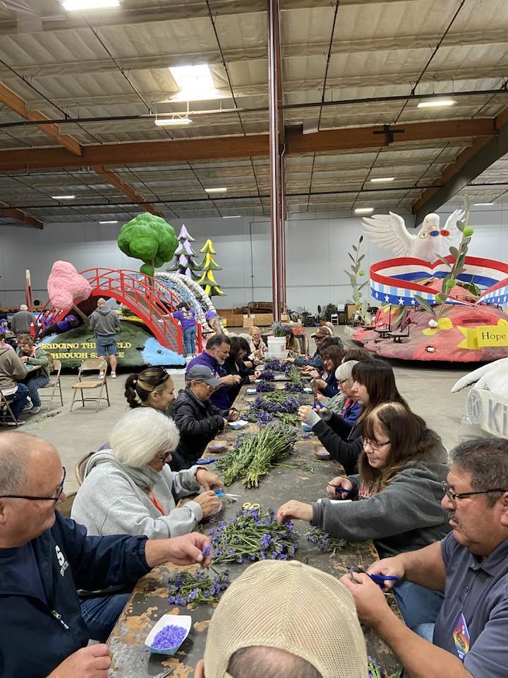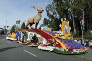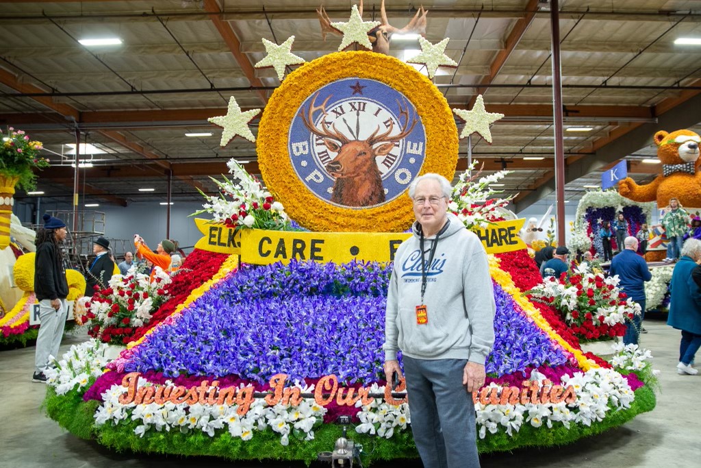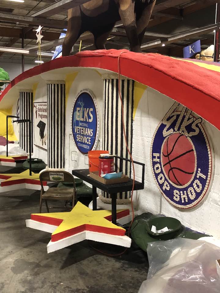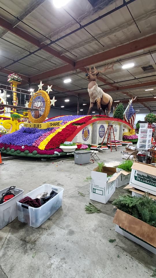 Over 1,000 proud Elk Members volunteered over a ten-day period to decorate the float, which included three days of dry decorations and seven days of flower decorations. Each day consisted of two shifts: from 8a.m. to 4p.m. and 4p.m. to 9p.m.  We had volunteers from Hawaii, Massachusetts, New Jersey, Arizona, Colorado, Utah, and all up and down California. Meals were provided to all volunteers. A volunteer pin was given to each volunteer. The Float contained more that 30,000 flowers and other plant-based decorations. The Float dimensions were 35 feet long by 18 feet wide and 25 feet high. As the float preceded down Colorado Blvd the song being played from the float was God Bless The U.S.A. by Lee Greenwood.  Elks passed out mini basketballs and 5,000 Coloring books to parade viewers.