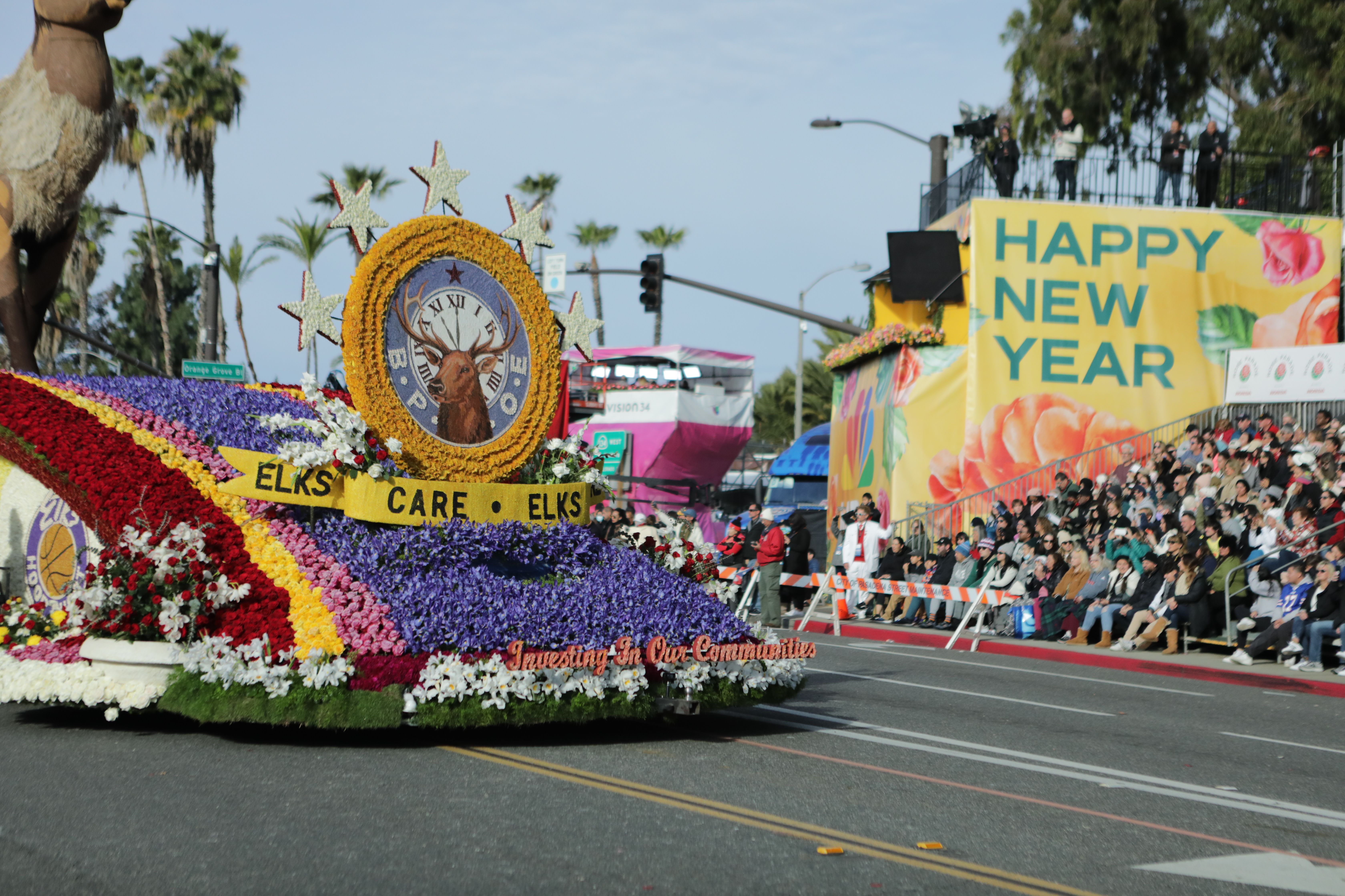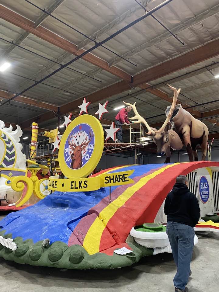 The centerpiece of the 2023 Elks, “Investing in Our Communities” float is the noble creature that is the symbol of the Order. The elk is a peaceful animal but will rise in defense of its own in the face of a threat. The majestic creature is fleet of foot and keen of perception. He is placed at mid float perched on a floral carpet celebrating the New Year with multiple shields detailing the commitment of Elks USA to youth (Elks Hoop Shoot), American Military Service (Elks National Veterans Service Commission), and Education (Elks National Foundation Scholarship Programs)
