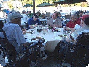 The Veterans from the Spinal Cord Injury unit, the Traumatic Brain Injury ward, the Poly Trauma Ward, the Western Blind Center and the PTSD group arrived at the Lodge in three VA Hospital buses where they were seated with a view of the lodge swimming pool. From this scenic vantage point the Veterans were able to watch the lodge members and their families enjoying the pool and everyone appreciated the beautiful sunny weather.